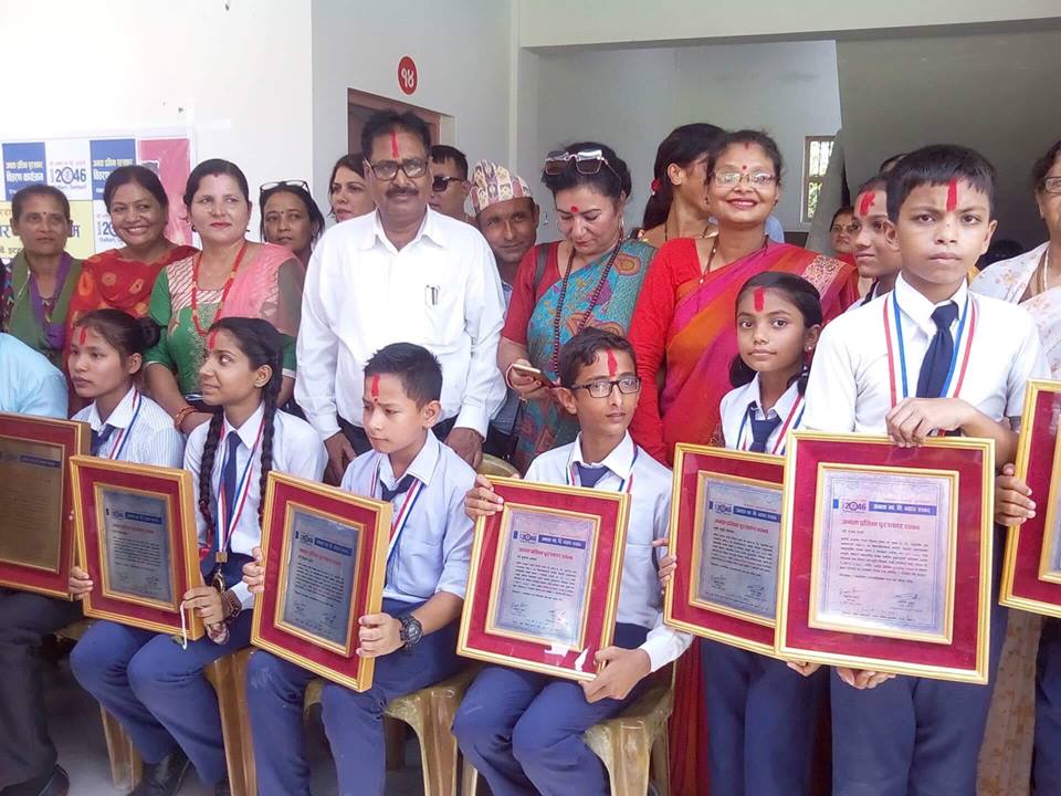 २०४६ सालमा एसएलसी परीक्षा उत्तीर्ण गरेका विद्यार्थीहरूको समूहले कक्षा १ देखि १० सम्म उत्कृष्ट नतिजा ल्याउने १० जना विद्यार्थीलाई कक्षाअनुसार नगद र वितरण गरेको हो ।
